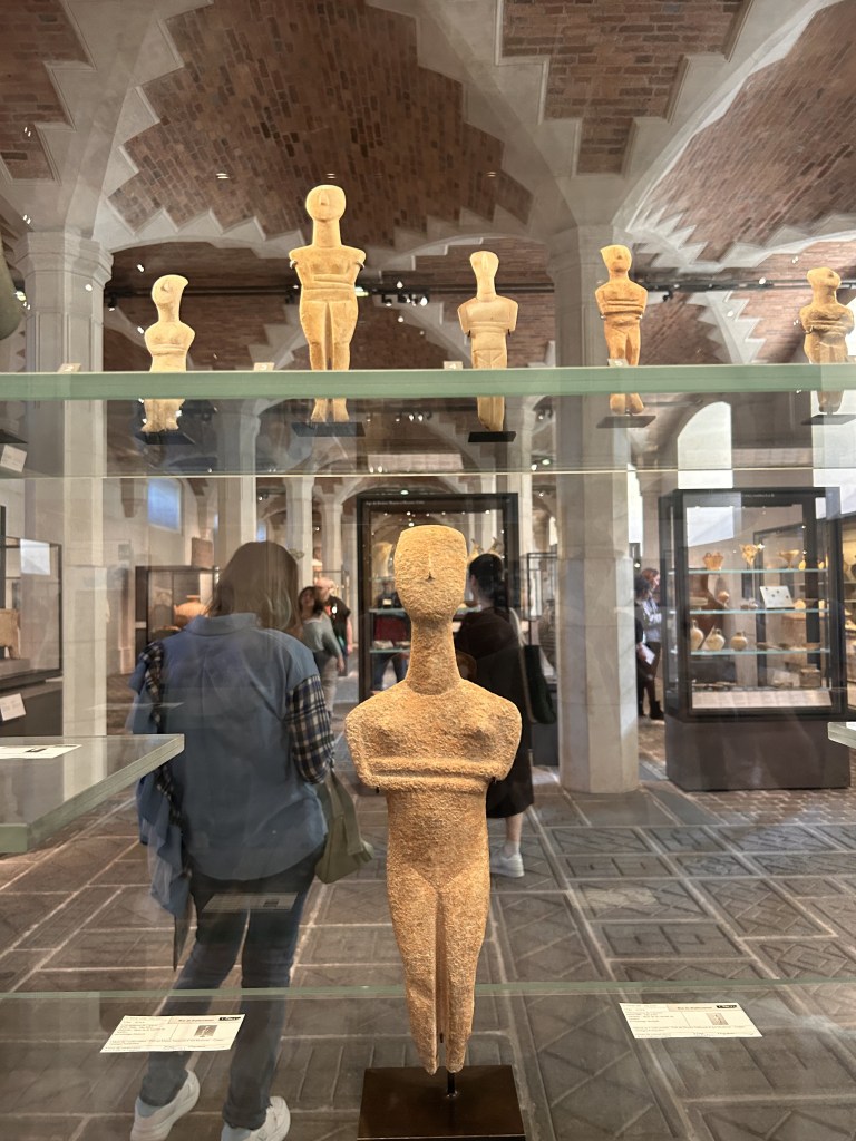 I first arrived at the Ancient Greek exhibit, and there were many objects to be observed. The exhibit was formatted in such that there were objects on either side of the large room, and individual objects encased and scattered throughout the space. Some important objects I noted were from the Orientalizing and Cycladic Period, which I appreciated because I learned about them in my History of Art class I took on Western Medieval Art last fall semester. One thing I found interesting was that they didn’t decide to encase a huge brown pot, and instead put it next to a door. I found that a bit abnormal, because that would mean thousands of people might take the opportunity to touch it and risk damaging the object. From these concerns, a critical question arises: How do curators balance the need for public engagement with the preservation of historical and cultural artifacts? While I understand that this may be a difficult question to answer, I genuinely hope that museums are all able to effectively take care of these precious objects that hold cultural and historical significance.
